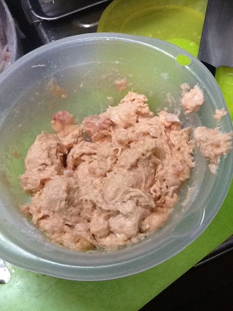 今回はボソボソを恐れて鶏ミンチと、オリーブ油を若干入れてます。